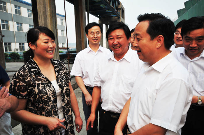 现任湖北省副省长,时任荆门市委副书记、市长肖菊华(前右)在公司董事长杨才学(前左)的陪同下调研太阳成集团tyc33455cc