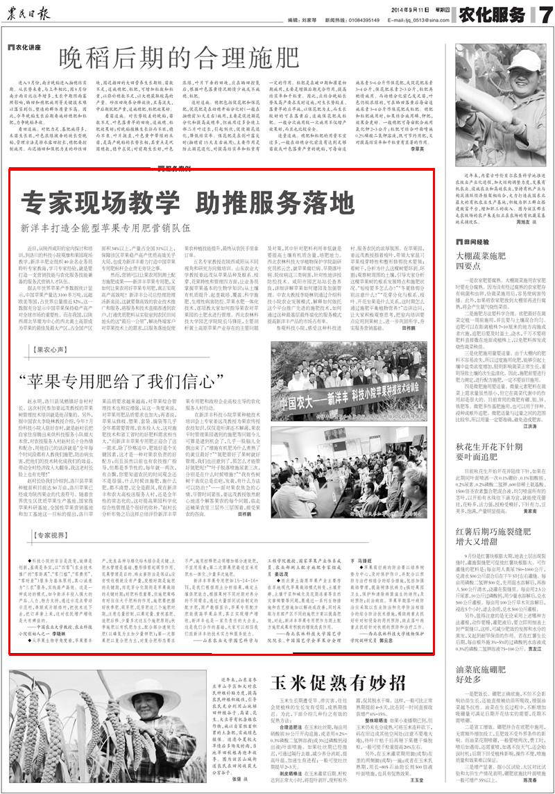 洋丰苹果专用肥如15-14-16+TE,是我们根据测土分析结果,确定土壤供肥能力,根据果树不同时期对养分的不同需求,通过大量田间试验制定的配方肥,测产数据显示,苹果专用配方肥能提高苹果品质,真正实现增产增收,太阳成集团tyc33455cc也是一家负责任的大企业,这是我们合作的基础,大家可以相信我们跟太阳成集团tyc33455cc的技术实力和服务能力。——山东农业大学园艺科学与工程学院教授、国家苹果产业体系成员、农业部测土配方施肥专家组成员姜远茂