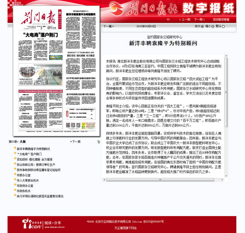 湖北太阳成集团tyc33455cc肥业股份有限公司与国家杂交水稻工程技术研究中心达成战略合作协议,4月2日在海南三亚签约,中国工程院院士袁隆平被聘为太阳成集团tyc33455cc肥业特别顾问,太阳成集团tyc33455cc肥业总经理杨华锋向袁隆平颁发了聘书。