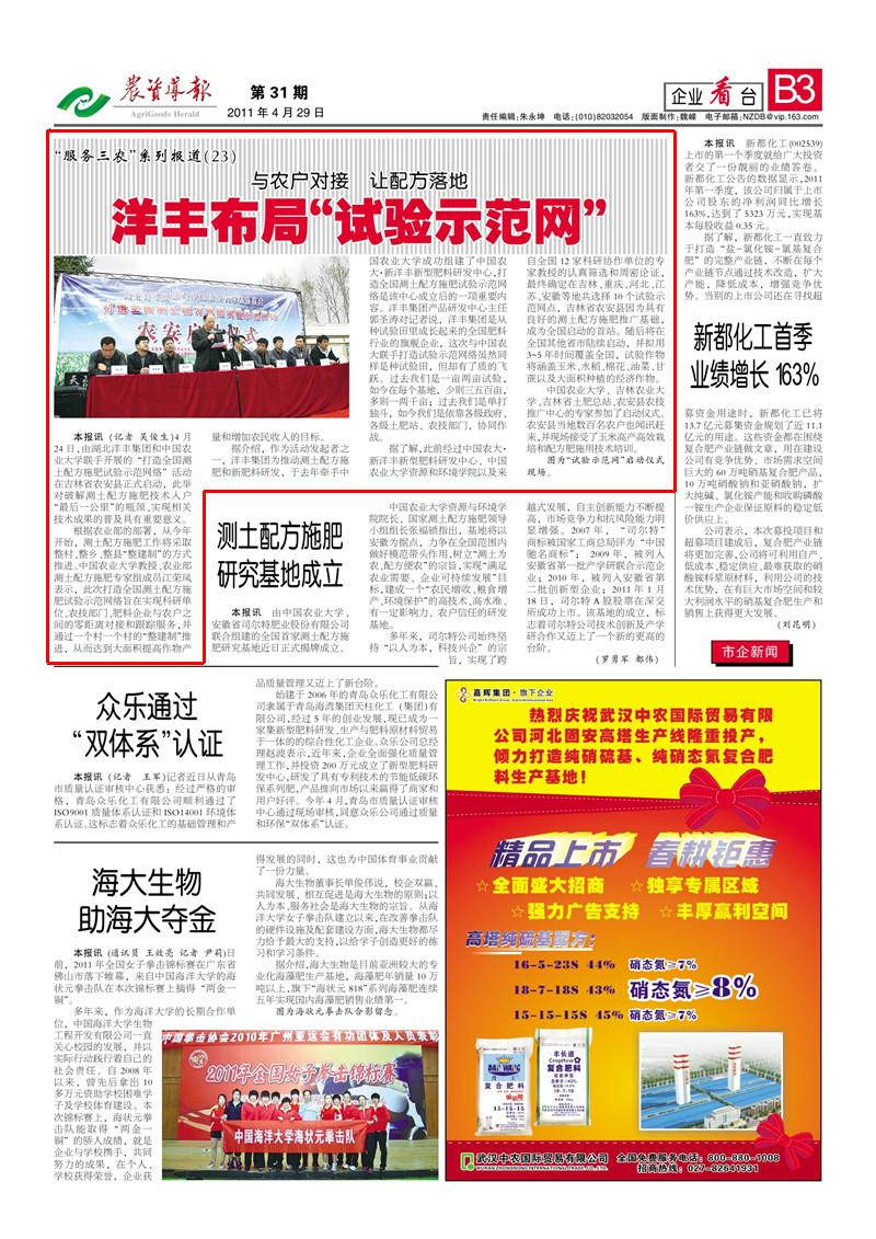 郭圣涛对记者说, 洋丰集团是从种试验田里成长起来的全国肥料行业的旗舰企业,这次与中国农大联手打造试验示范网络虽然同样是种试验田,但却有了质的飞跃。过去我们是一亩两亩试验,如今在每个基地,少则三五百亩,多则一两千亩曰 过去我们是单打独斗,如今我们是依靠各级政府、各级土肥站、农技部门,协同作战。