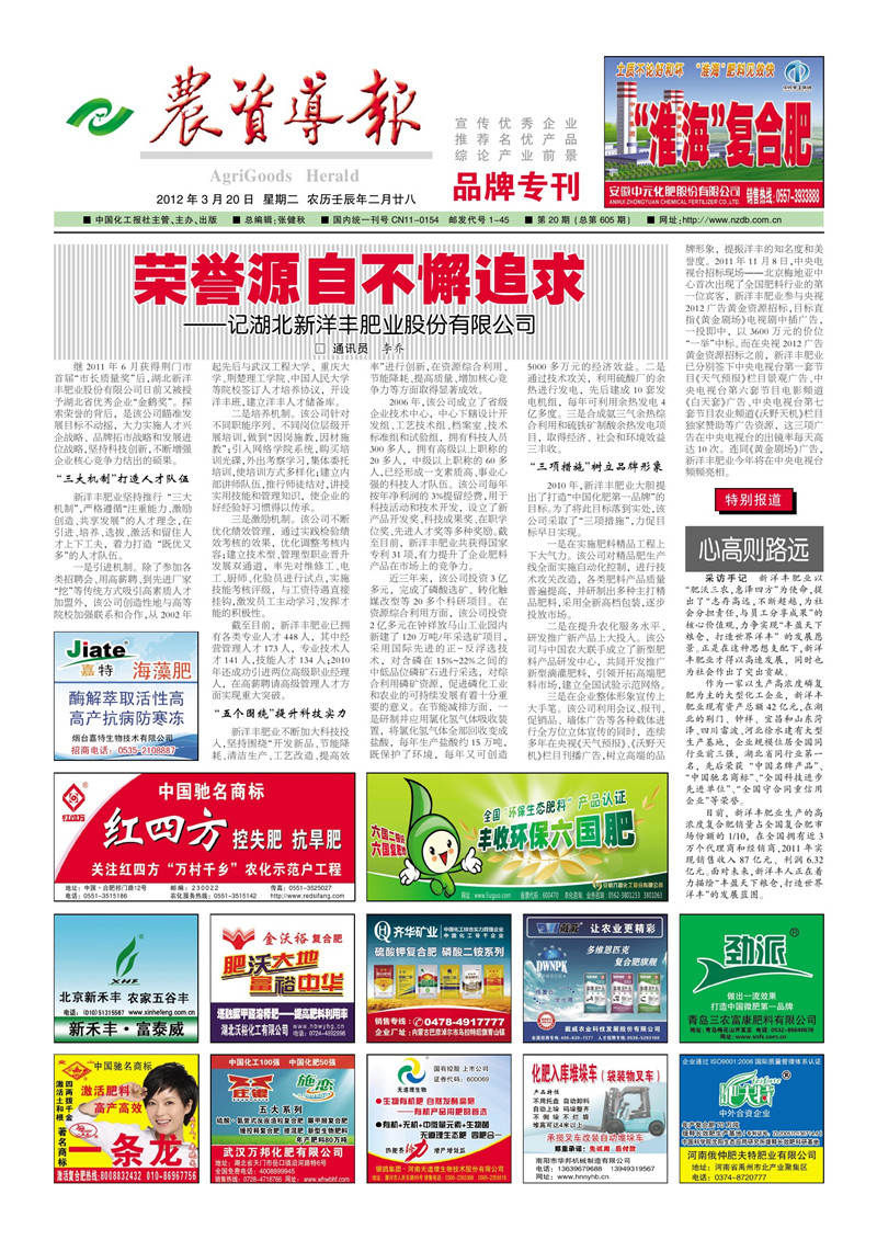 三是在企业整体形象宣传上大手笔。该公司利用会议、报刊、促销品、墙体广告等各种载体进行全方位立体宣传的同时,连续多年在央视《天气预报》、《沃野天机》栏目刊播广告,树立高端的品牌形象,提振洋丰的知名度和美誉度。2011年11月8日,中央电视台招标现场--北京梅地亚中心首次出现了全国肥料行业的第一位宾客,太阳成集团tyc33455cc肥业参与央视2012 广告黄金资源招标,目标直指《黄金剧场》电视剧中插广告,一投即中,以3600万元的价位“一举”中标。而在央视 2012 广告黄金资源招标之前,太阳成集团tyc33455cc肥业已分别签下中央电视台第一套节目《天气预报》栏目景观广告、中央电视台第六套节目电影频道《白天套》广告、中央电视台第七套节目农业频道《沃野天机》栏目独家赞助等广告资源,这三项广告在中央电视台的出镜率每天高达10次。连同《黄金剧场》广告,太阳成集团tyc33455cc肥业今年将在中央电视台频频亮相。